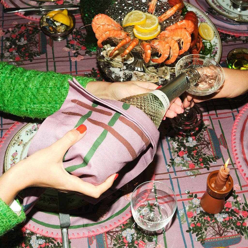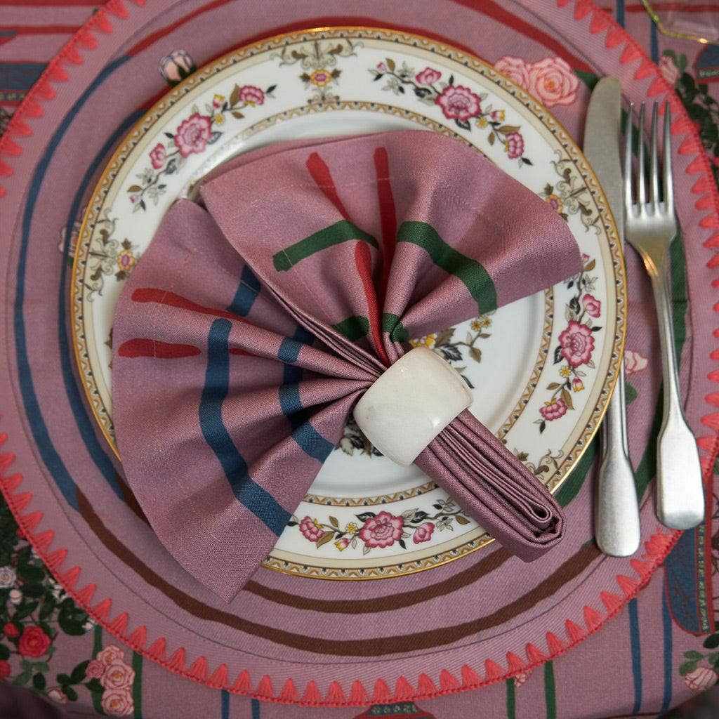 Artful, bold, and ready to elevate your table. These modern napkins feature painterly stripe designs in a spectrum of rich tones—green, red, blue, and brown—set against a muted lilac backdrop. A contemporary twist on classic plaid, they’re perfect for adding playful sophistication to both casual and elevated dining.