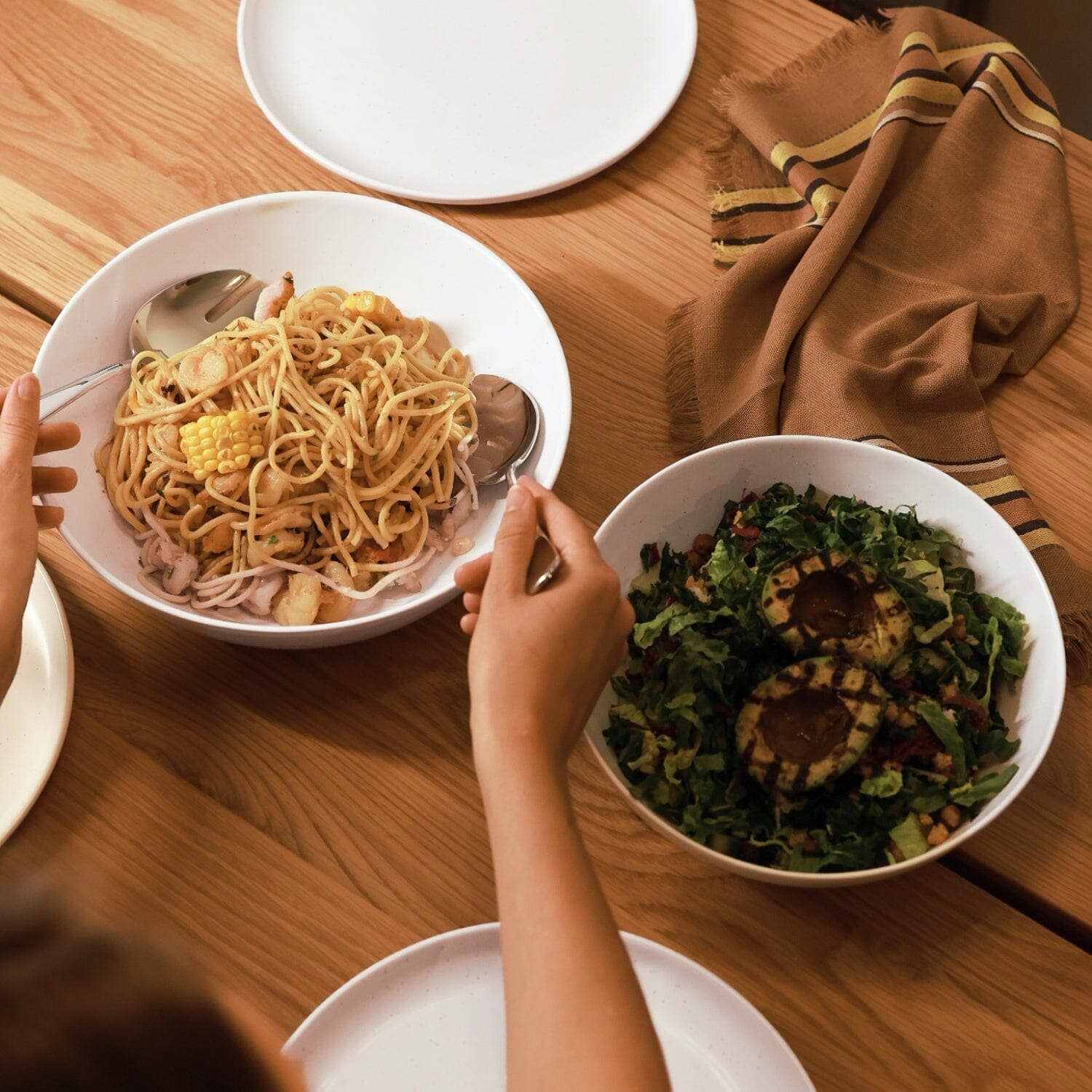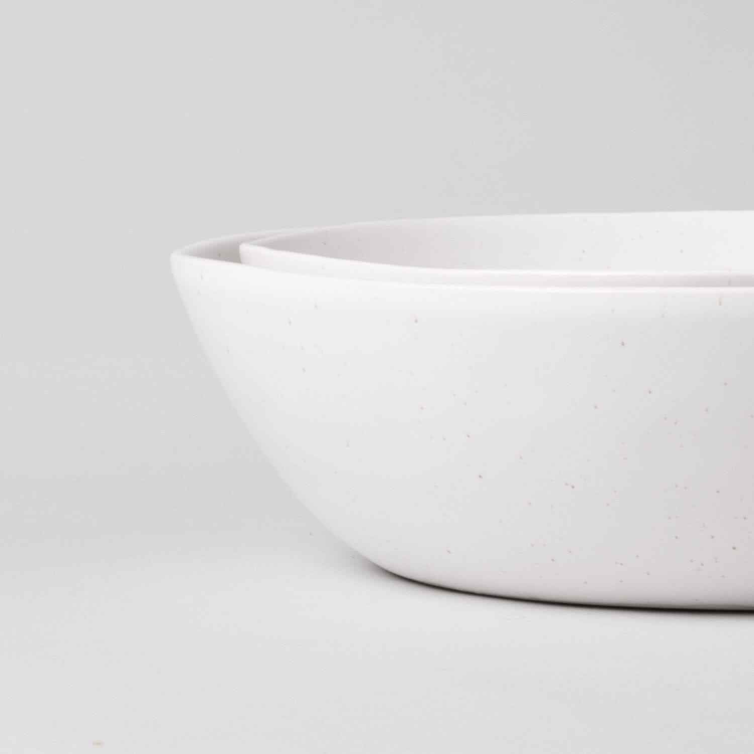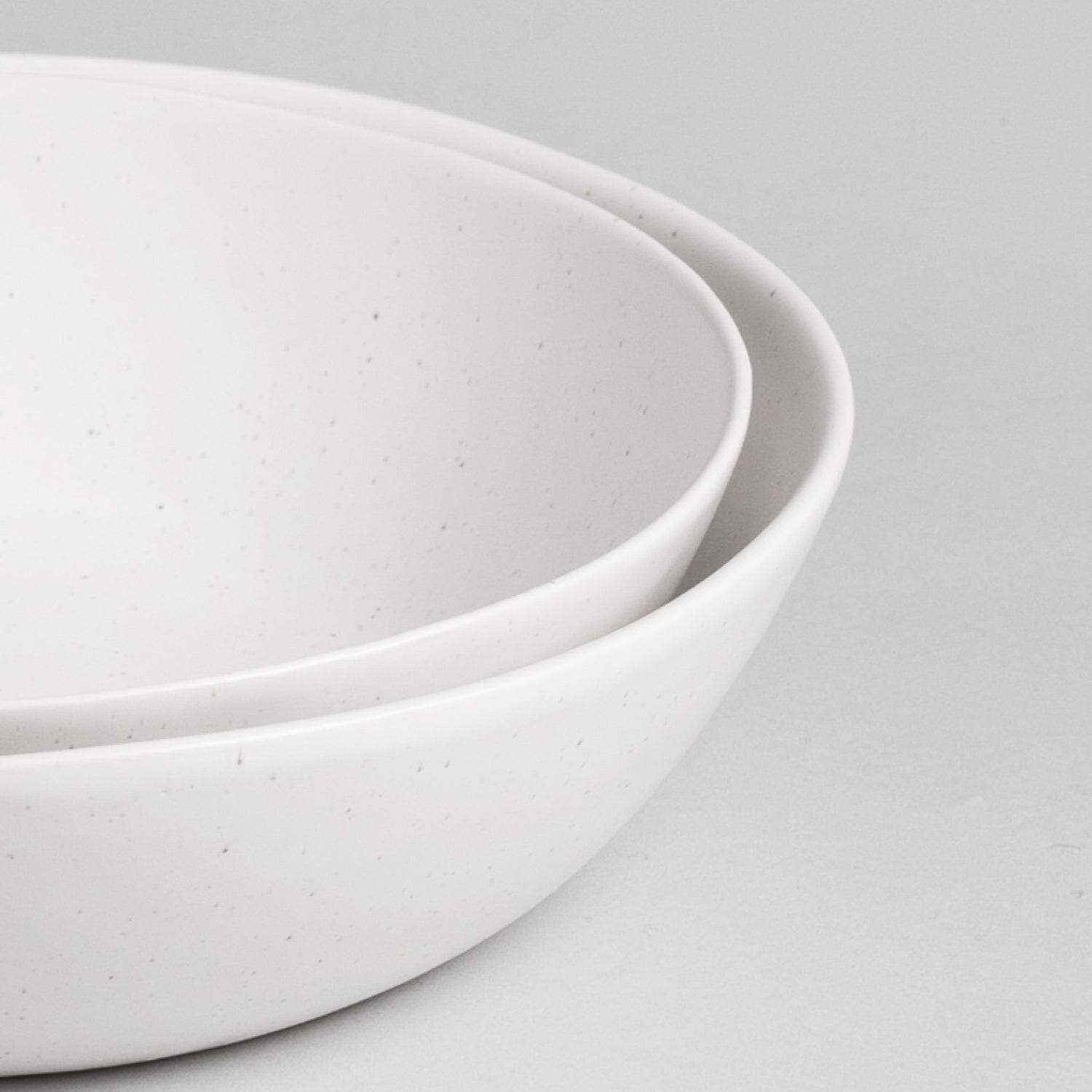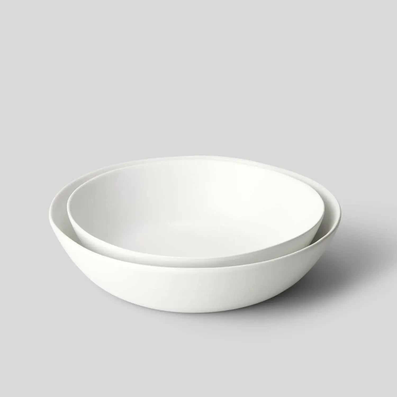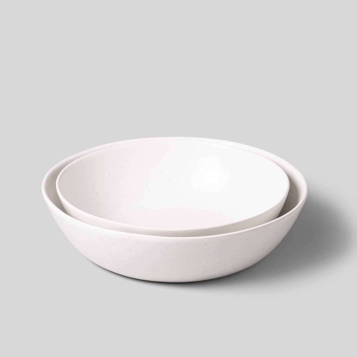Show off pasta dishes, salads, and more with this perfectly low-profile pair. A shallow take on The Nested Serving Bowls, they nest together for simple storage and look great on display. * Each bowl is organically shaped and one of a kind * Hand-finished in Portugal * Comes in a set of 2 Stoneware contains natural flecks that come to the surface during firing and may show through lighter glazes. Slight variations may occur. MaterialsArtisan crafted stonewareLocal Portuguese clayLead-free semi-matte glazeDesigned in Vancouver, crafted in PortugalOur ceramics are durable and easy to care for. * Dishwasher, microwave, and oven safe up to 450ºF * All semi-matte ceramics are susceptible to superficial marks from your flatware.
